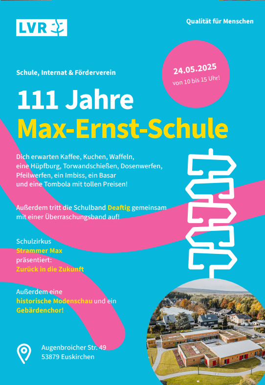 Internat und Schule lädt Sie ein zur 111 Jahre Feier der Max-Ernst-Schule. Wir freuen uns, wenn wir am Samstag, den 24. Mai 2025 viele Schüler*innen, Ehemalige, Eltern, Freunde und Förderer unserer Schule begrüßen dürfen.